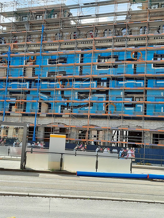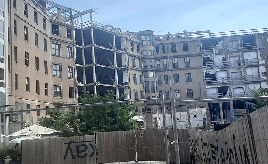 Lange ging nichts mehr auf der Baustelle des berühmten Luxus-Hotels Astoria. Hinter der einstigen Prachtfassade hatte sich in den letzten zweieinhalb Jahren Müll getürmt, der mittlerweile drohte, zum Umweltproblem zu werden: Das Grundwasser hat sich zum grün schimmernden See entwickelt, auf dem inzwischen alte Baurohre, Reifen, Kanister und Schutt schwimmen.